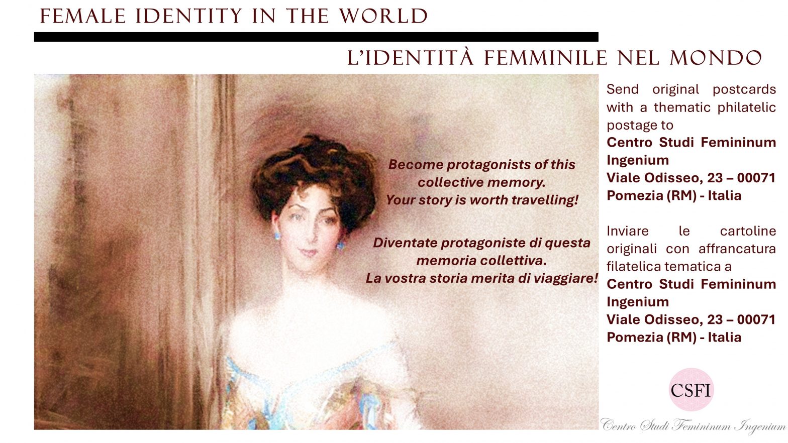 Each postcard received will become part of an important collection dedicated to the study of women’s history, contributing to an exhibition that will not only be a review of images, but a profound analysis of female identity and its impact on world history.